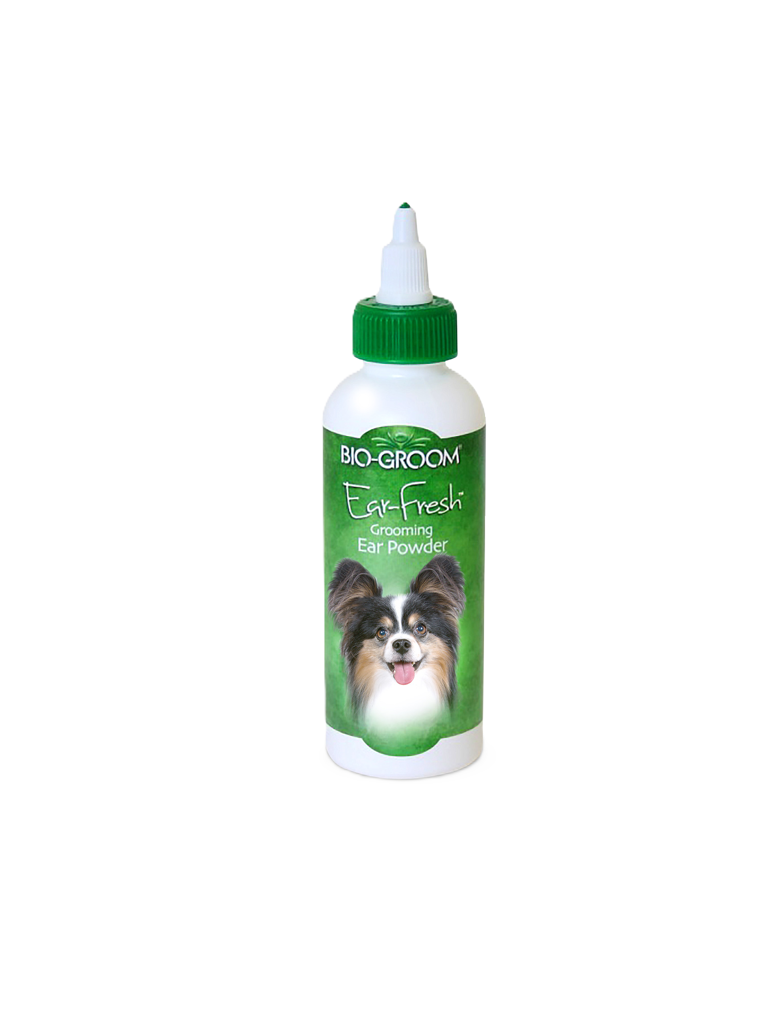 Clean ears first. Use cotton swabs and Bio-Groom ® Liquid Ear Care Lotion. Then, gently puff Ear Fresh into the ears to keep them dry and odor free. To remove unwanted hair from the ear canal, puff Ear Fresh into the ear and remove hair with forceps or tweezers. For hand stripping, use the amount necessary to achieve the desired results. Should your dog or cat have a painful ear condition or discharge from the ear, see your veterinarian.