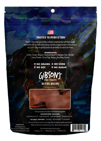 Our natural, grain-free, bacon treats with Alligator are made in a using high quality, human grade ingredients (nothing from China). Our unique toasting process seals in the flavor and enhances palitability. These soft treats are then packed in our artful bags ready to be enjoyed by all dogs.