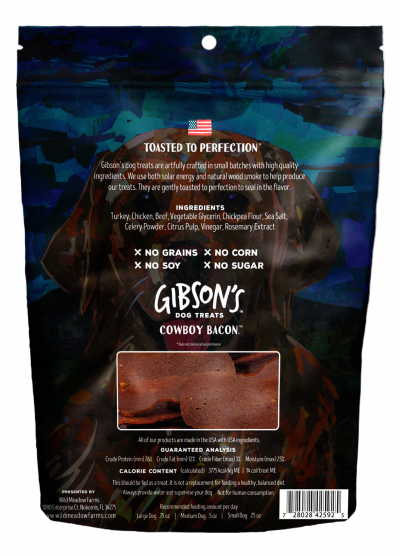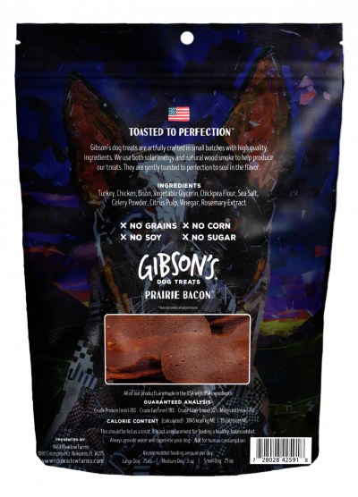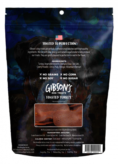 Gibson's Toasted dog treats are artfully crafted in small batches with high quality ingredients. We use both solar energy and natural wood smoking to help produce our treats. They are gently toasted to perfection to seal in the flavor. We like to think of this as our ultra-soft jerky line.