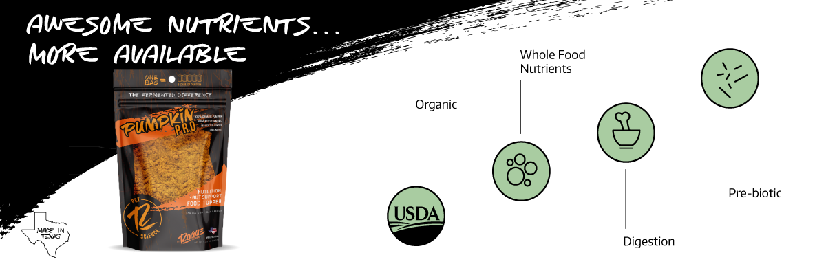 No Grains • No Fillers • No Synthetics • No By-Products • Organic Pumpkin (without seeds or skin) • Organic Fermented Turmeric Root • Organic Fermented Ginger Root